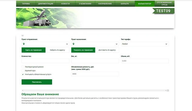 • Настройка калькулятора перевозки